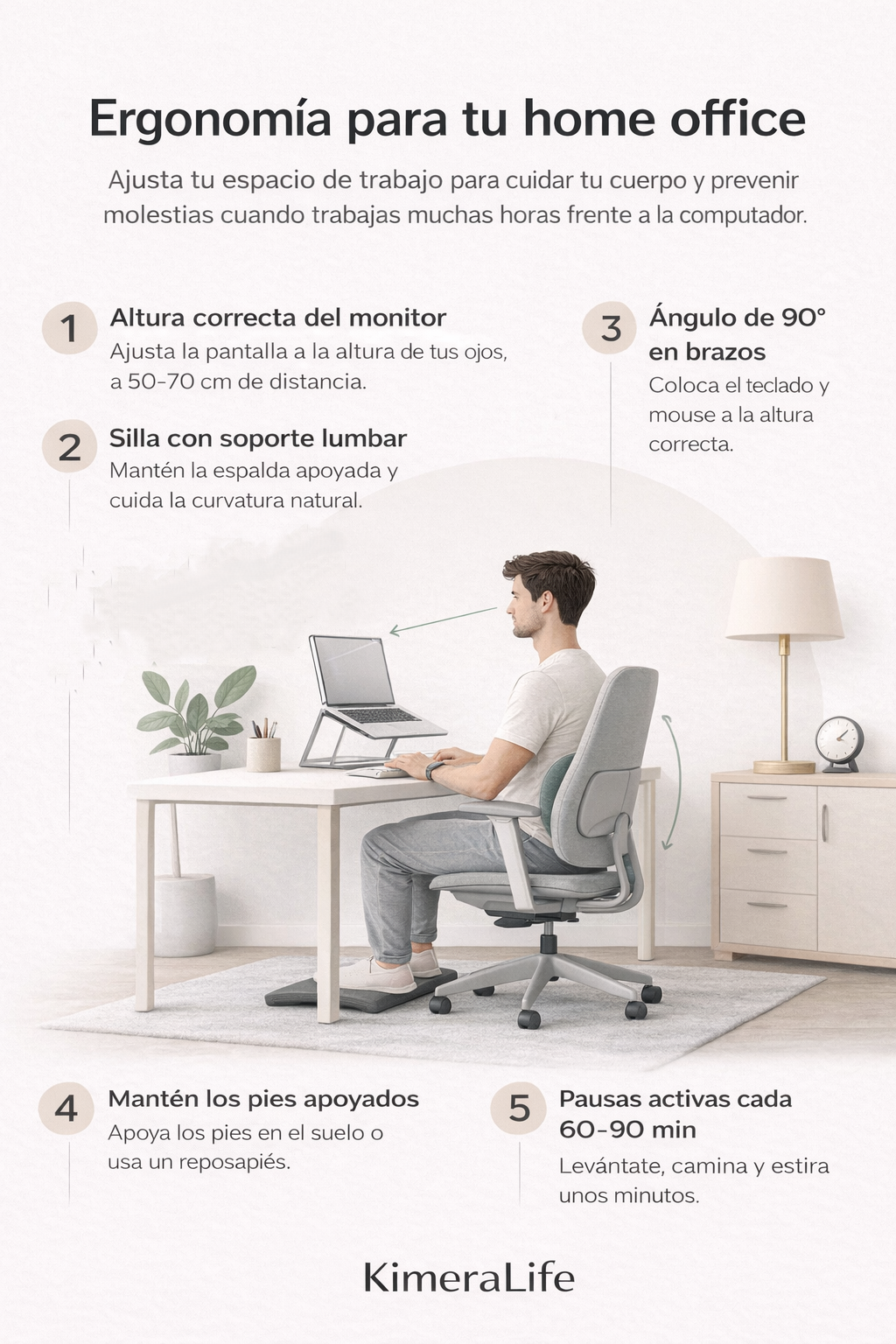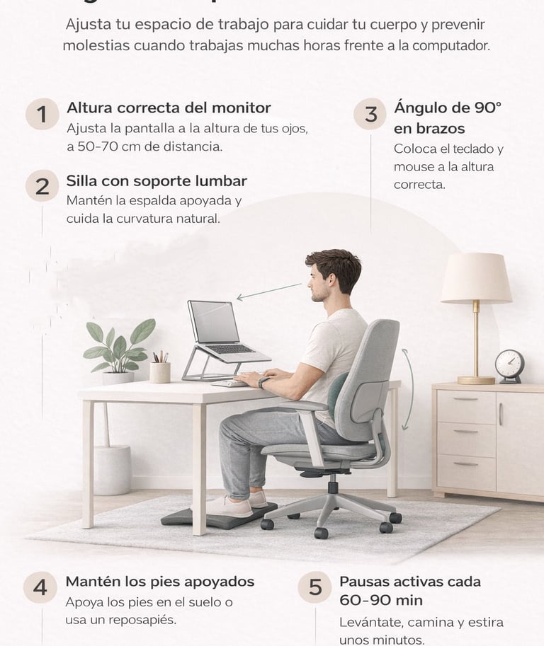 Trabajar muchas horas frente a la computadora puede generar tensión en el cuello, los hombros y la espalda. Con pequeños ajustes en tu espacio de trabajo es posible mejorar la postura y reducir molestias durante el día. Mantener el monitor a la altura de los ojos, usar una silla con soporte lumbar, colocar el teclado a una altura cómoda y apoyar bien los pies puede marcar una gran diferencia. En KimeraLife creemos que combinar tecnología, buenos hábitos y un entorno de trabajo ergonómico es clave para cuidar tu bienestar en la vida moderna.